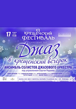 Программу «Джаз в Крещенский вечерок» 17 января исполнит на фестивале Ансамбль солистов Джаз-оркестра под управлением Сергея Радаева. Настроение этого зимнего вечера создадут любимые слушателями артисты, которые исполнят пьесы Александра Варламова, Константина Бахолдина, Давида Голощекина, Георгия Гараняна.