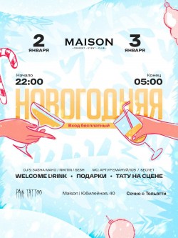 Уже совсем скоро все мы будем встречать Новый год! Рад объявить совместно с Maison о нашей тусовке для жителей города! Она будет бесплатной для абсолютно каждого. Диск-жокеи: MAKO, NIKITIN, SESH